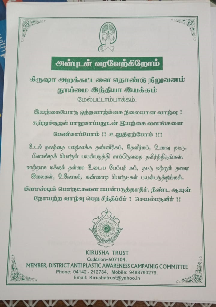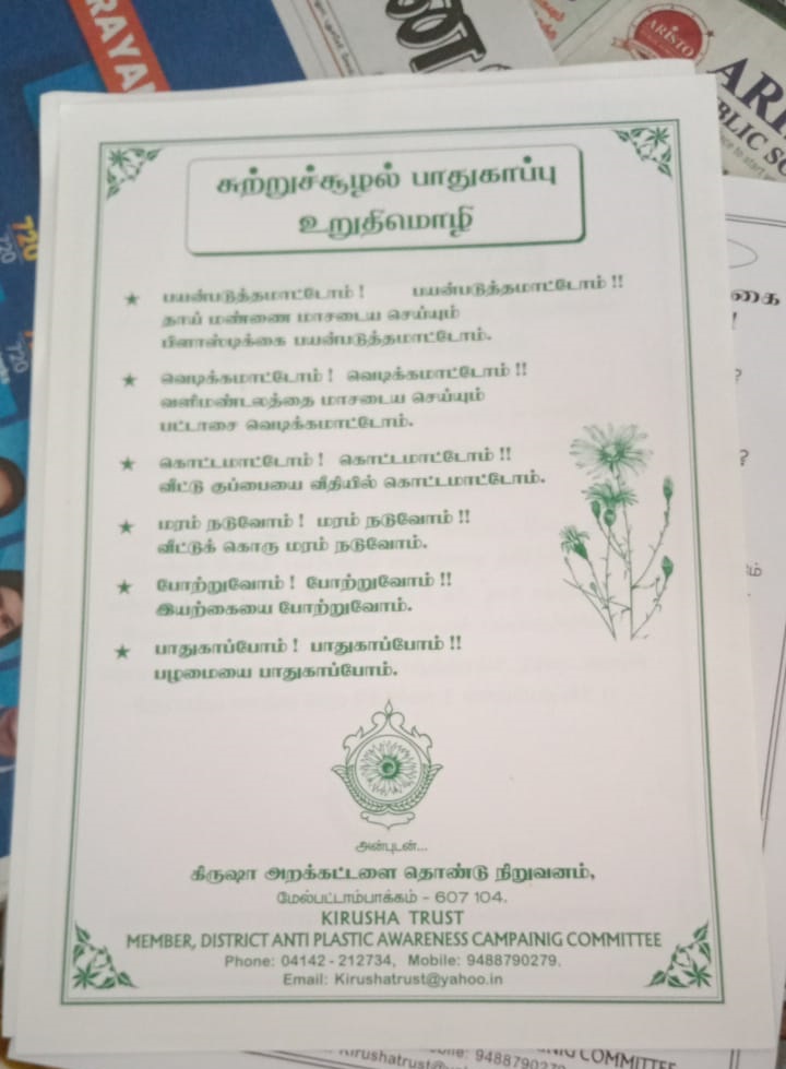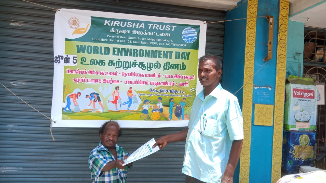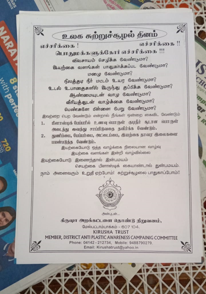 கிருஷா அறக்கட்டளை சார்பில் மேல்பட்டாமபாக்கம்பேரூராட்சியில் உலக சுற்றுச்சூழல் தினம் விழிப்புணர் நிகழ்ச்சி நடைபெற்றது நிகழ்ச்சியில் அறக்கட்டளை நிறுவனர் திரிசங்கு அவர்கள் பிளாஸ்டிக் பயன்படுத்தக்கூடாது என்பதற்கான துண்டு பிரசுரங்கள் மாற்றுத்திறனாளி ஜெயராமன் என்பவருக்கு கெடுத்து தொடங்கி வைத்தார் பிறகு மாற்றுத்திறனாளி ஜெயராமன் அவர்கள் கீழ்க்கண்ட அனைத்து இடங்களுக்கும் தானே சென்று விழிப்புணர்வு வாசகங்கள் அடங்கிய துண்டு பிரசுரங்களை வழங்கினார் இந்தியன் வங்கி பேரூராட்சி அலுவலகம் ஆரம்ப சுகாதார நிலையம் மின்வாரியம் அஞ்சலகம் போன்ற அரசு அலுவலகங்கள் அங்கே வரப்பெற்ற பொதுமக்கள் மற்றும் காமராஜர் சிலை அம்பேத்கர் சிலை அருகில் துண்டு பிரசுரம் வழங்கினார் ஜெயராமன் செயலை கண்டு வியந்த பொதுமக்கள் நன்றி தெரிவித்து கோரிக்கையை ஏற்று பாராட்டினார்