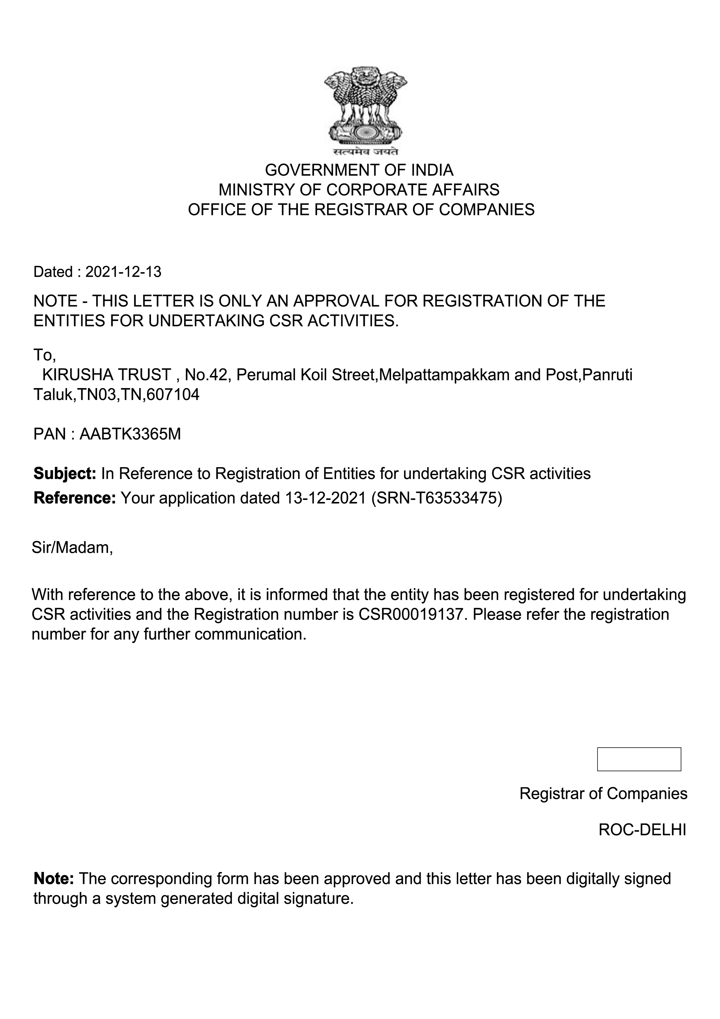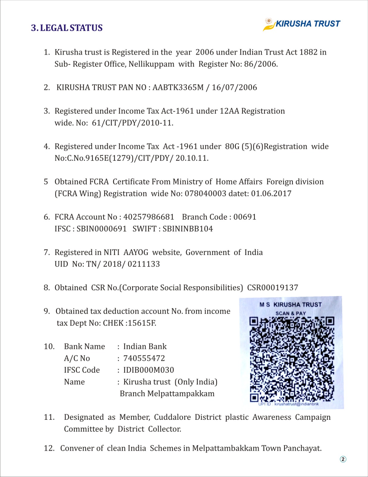 • Kirusha trust is Registered in the year 2006 under Indian Trust Act 1882 in Sub- Register Office, Nellikuppam with Register No: 86/2006.